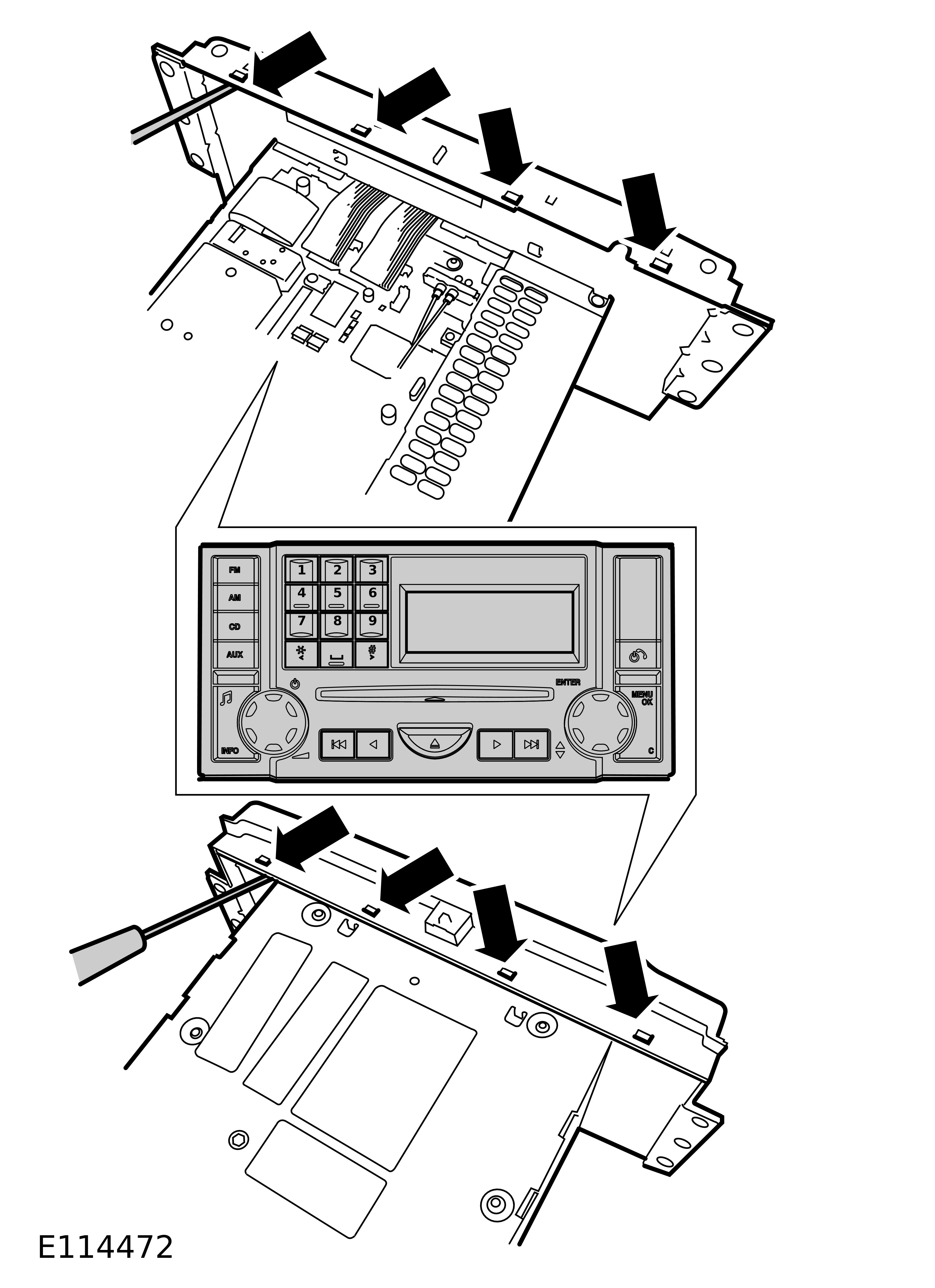 - Push the audio unit fascia to the IHU main body and make sure the audio unit fascia is secured with the 8 clips.