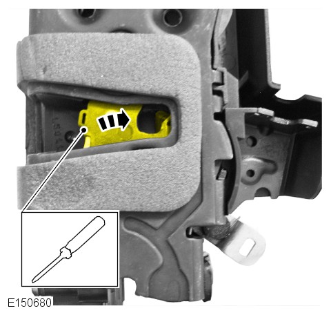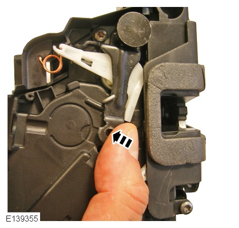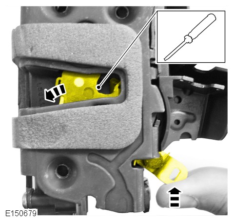 When the latch is still in its unlocked state, push the latch interior release lever against its return spring, when simultaneously applying a light pressure to release the latch claw using a small screw driver or similar
