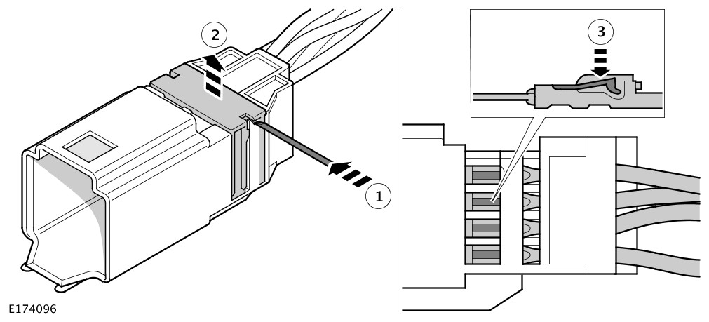 The MOST connector(s) have an anti-backout device which prevents the contact from being released from the connector. The anti-backout device must be released before attempting to remove the terminal from the connector. The anti-backout devices require a special tip to release the device. Please refer to the Electrical Reference Library (ERL) for the correct tool(s) to use.