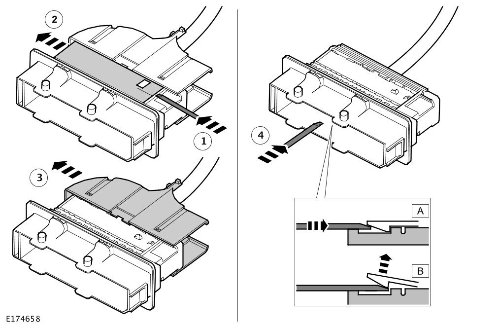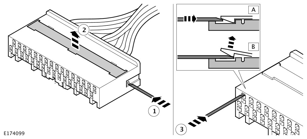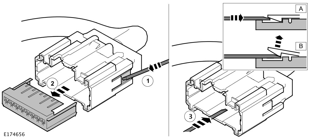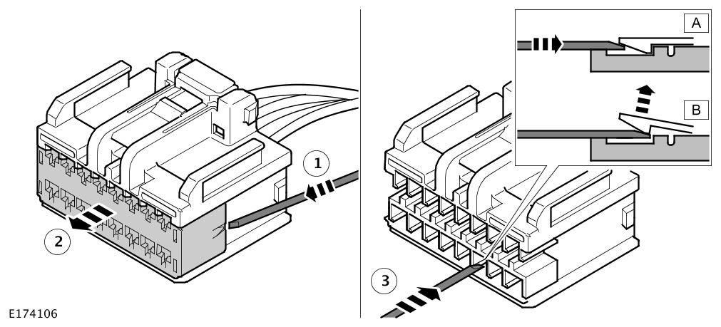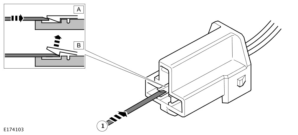 It must be noted that some electrical connector(s) have anti-backout devices which prevent the terminals from being removed from the electrical connector. Some examples of these are shown in following illustrations. The anti-backout device must be released before attempting to remove the terminal from the electrical connector. Some anti-backout devices require a special tip to release the device. Please refer to the ERL for the correct tool(s) to use (where applicable).