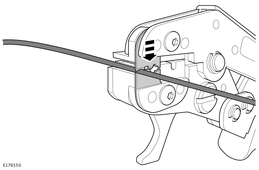 The following illustration shows the insulation stripper tool and a wiring harness correctly gripped in the jaws. A wire cutter is provided on the outer side of the fixed jaw.