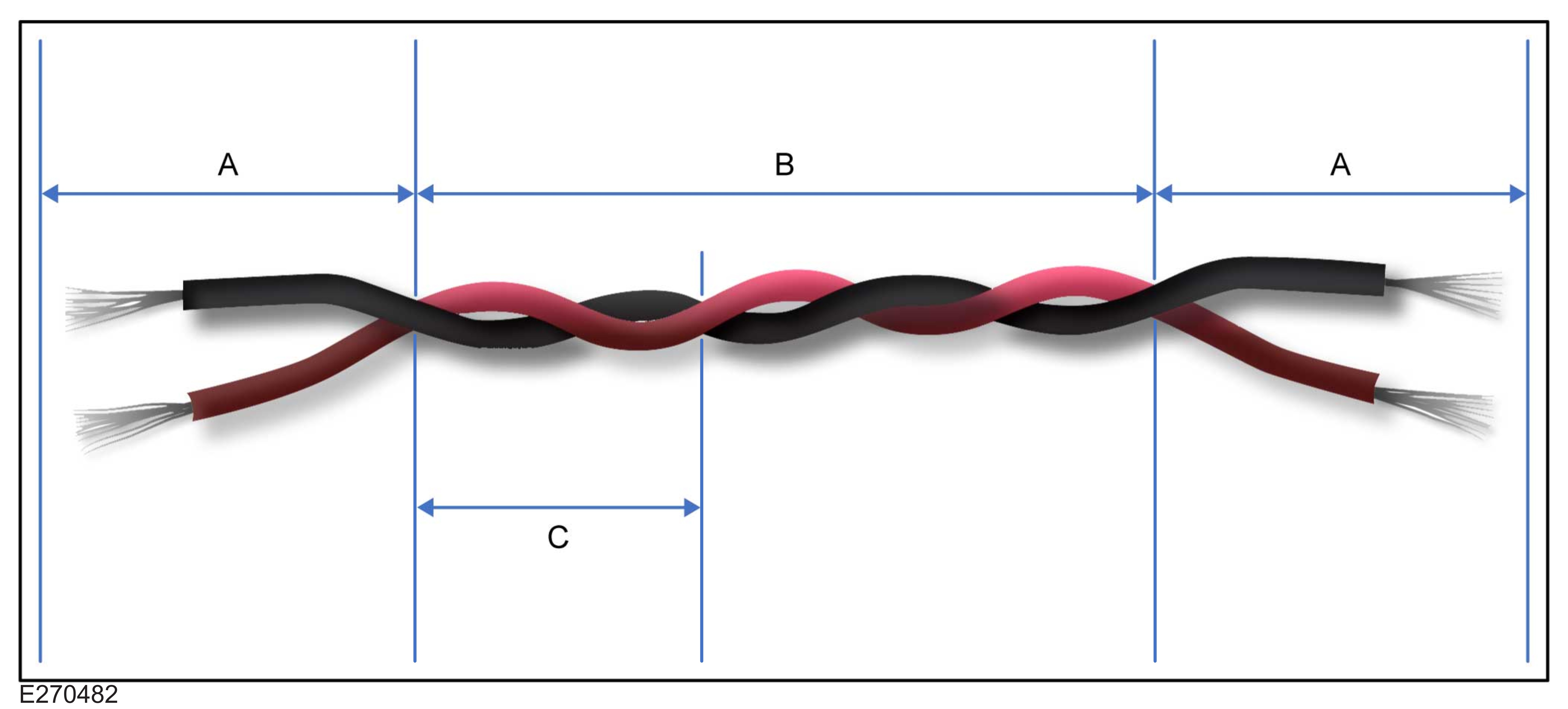 It is important to make sure that the number of turns over the repair length is counted at the start of the repair. Make sure that the same number of turns are reintroduced before fitting the terminals into the connector. If the original number of turns cannot be reintroduced on a twisted wire, the following dimensions must not be exceeded.