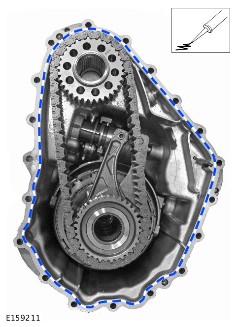 - Apply RTV sealant in a 2 mm bead to one surface of the transfer case mating faces as illustrated.