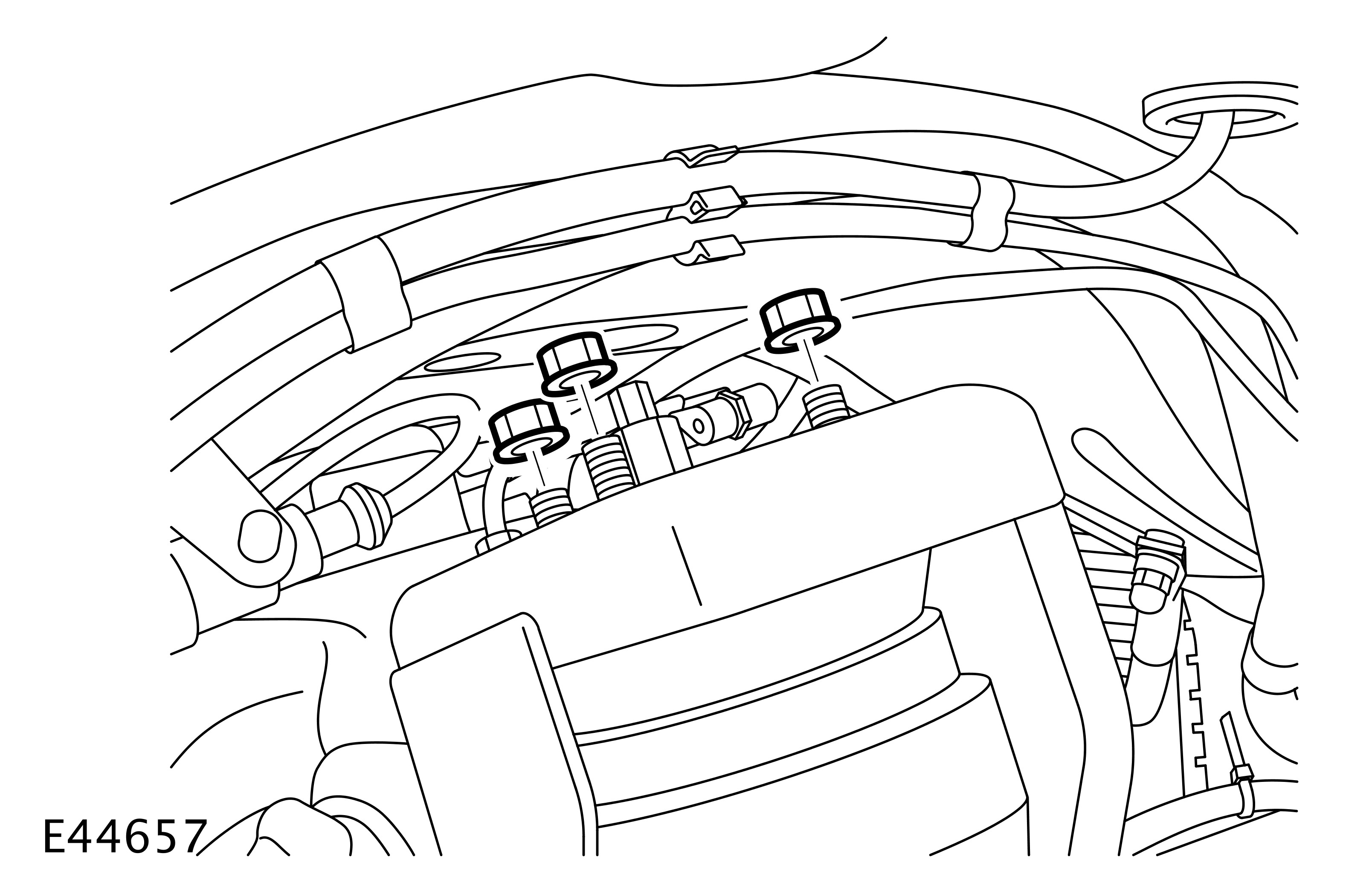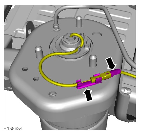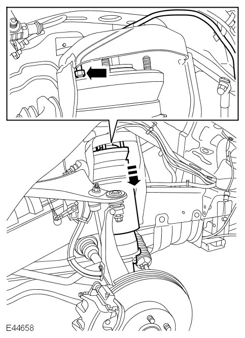 Install the shock absorber and air spring assembly. Make sure the shock absorber and air spring assembly top mounting to body mating faces are clean. Fit and tighten the nuts. Connect the air line into the Voss connector. Pull on the air line to make sure it is fully installed into the Voss connecter.