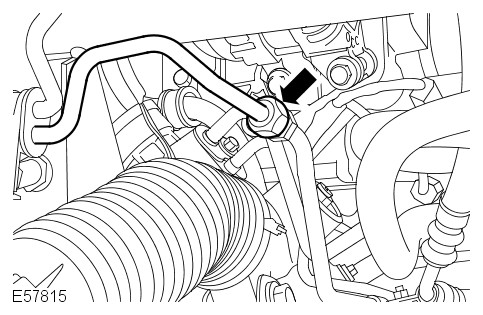 Position a container to collect the fluid spillage. Reposition the fluid line into the wheel arch area. Disconnect the fluid return line from the reservoir.