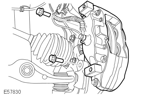 Remove the 2 retaining bolts. Tie the brake caliper aside. Release the brake caliper from the wheel knuckle.
