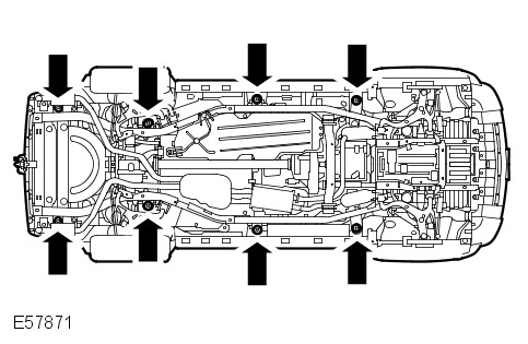 - Install the body mount retaining bolts. Tighten the 8 retaining bolts.