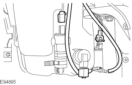Disconnect the 2 hoses from the windshield washer reservoir pumps. Drain the washer reservoir fluid. Disconnect the 3 electrical connectors.