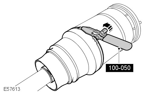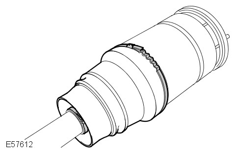 Install the air spring piston over the O-ring seals. Using the special tool coupled to a tire inflator with a gauge, apply approximately 2 bar of air pressure to the air spring to fully seat the piston over the O-ring seals.