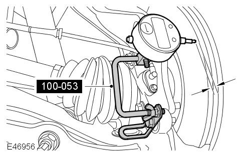 Using the special tool, install a dial indicator gauge to the brake caliper lower mounting.