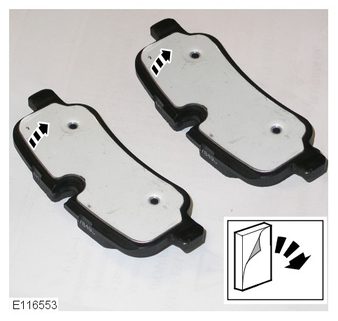 If equipped, the adhesive strips covering the outer brake pads must be removed before installation. Failure to follow this instruction may result in damage to the vehicle.