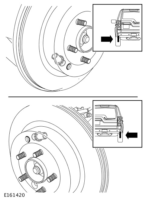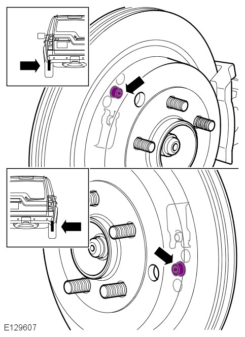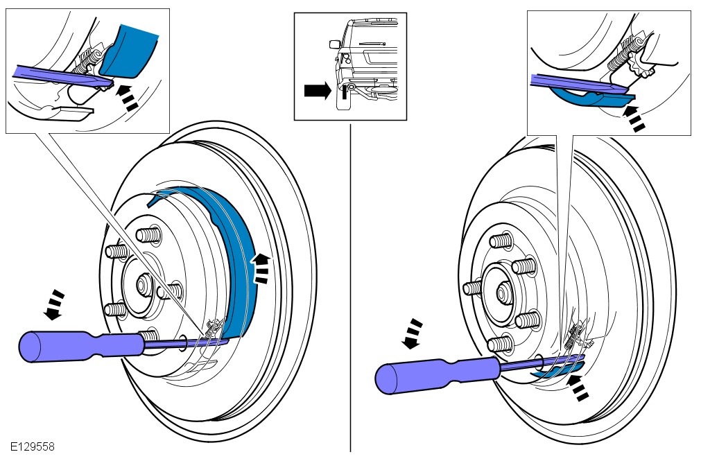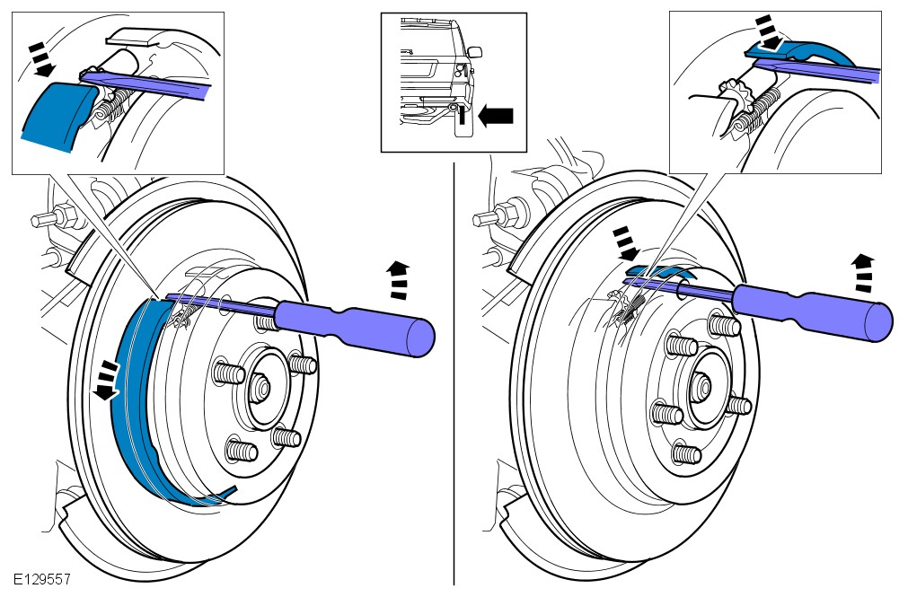 This procedure must be carried out if new park brake shoes are installed, new rear brake discs are installed, or if the vehicle has been mud wading (not water) for more than 50 miles or if the park brake is adjusted as part of a vehicle service.