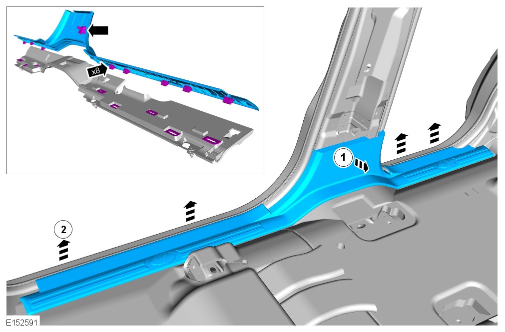 - Remove the B-pillar lower trim panel. For additional information, refer to: B-Pillar Lower Trim Panel (501-05 Interior Trim and Ornamentation, Removal and Installation).