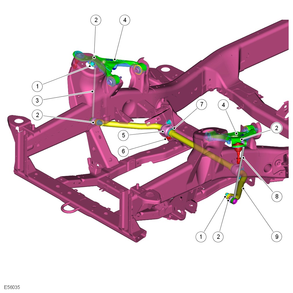 The front suspension is a fully independent design which offers a reduction in unsprung weight over the beam axle design. The front suspension comprises an upper arm, a lower arm, a wheel knuckle and hub, a stabilizer bar and links assembly and an air damper assembly. A conventional stabilizer bar is fitted to some models, with a Dynamic Response stabilizer bar system available as a standard or optional fitment. For additional information, refer to: Active Stabilization System (204-06 Ride and Handling Optimization, Description and Operation).