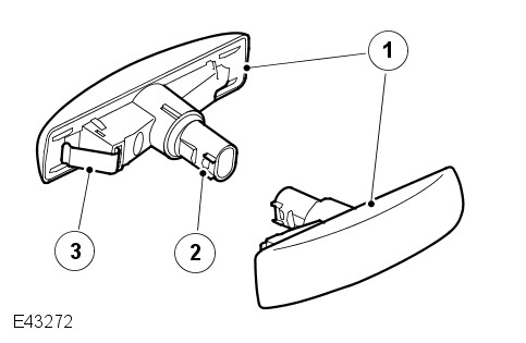 The repeater lamps are located in the driver and passenger doors, below each door mirror. The lamps are clipped into an aperture in the door panel and can be removed by sliding rearwards and releasing the front edge of the lamp from the door. The repeater lamps use a 5W capless bulb which is located in a holder.