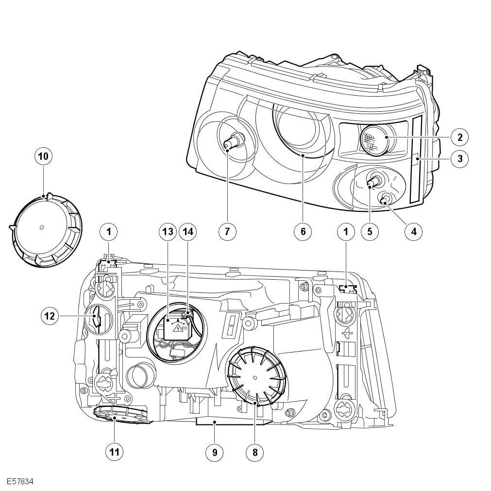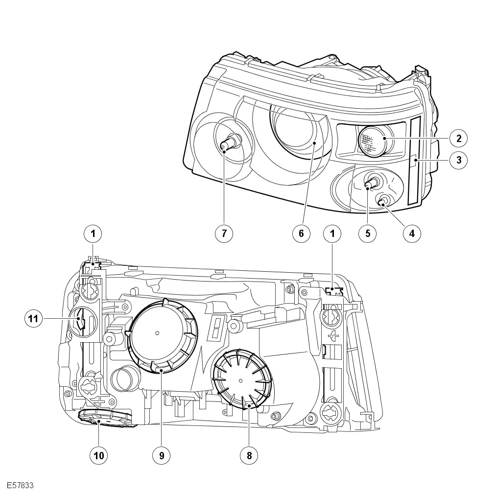The rear of the headlamp unit has removable access panels which allow access to the bulbs for replacement. A large cover, which is rotated anti-clockwise to remove, allows access to the low/high beam bulb on both halogen and xenon headlamps. Another removable cover provides access to the high beam only halogen bulb which is retained with a spring clip. A smaller cover, which is located behind the outer locking plate, can also be rotated anti-clockwise to provide access to the turn signal lamp bulb. Another cover located on the underside of the headlamp assembly provides access to the side lamp bulb, the cornering lamp/static bending lamp bulb and the side marker lamp bulb on NAS models.