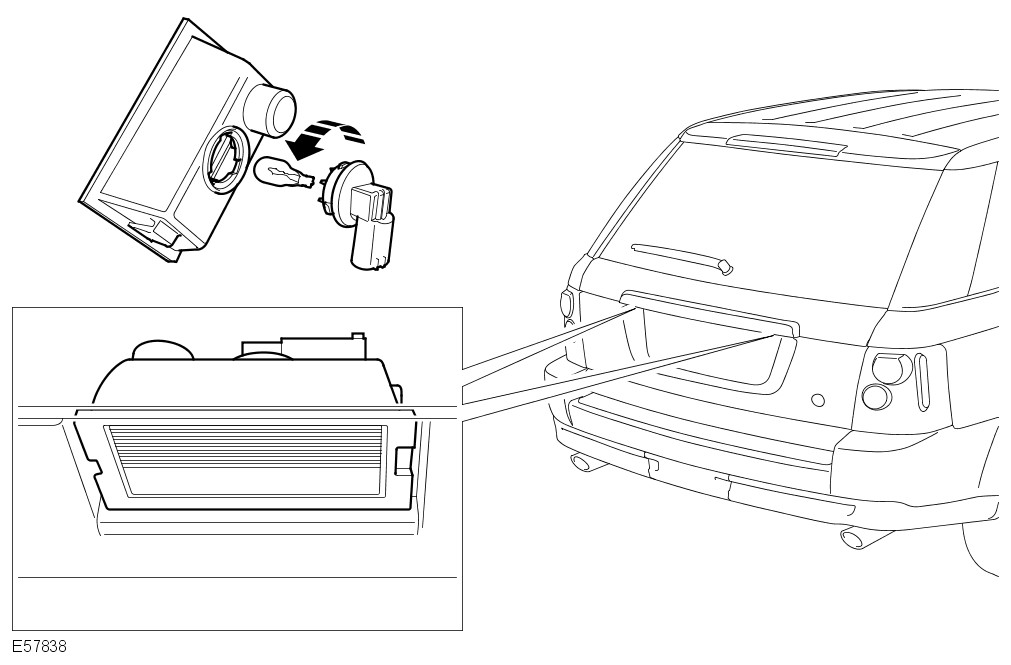 Two license plate lamps are fitted in the tailgate handle, above the license plate in the upper tailgate. Each lamp uses a 5W capless type bulb. The lamps are secured in the upper tail gate handle with integral clips. The lamps can be released from the handle using a small, flat blade screwdriver.