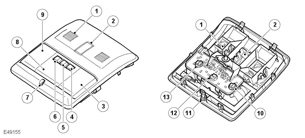 The main interior lamp is located in a housing which can also contain the sunroof switch and/or the voice activation microphones, depending on specification.