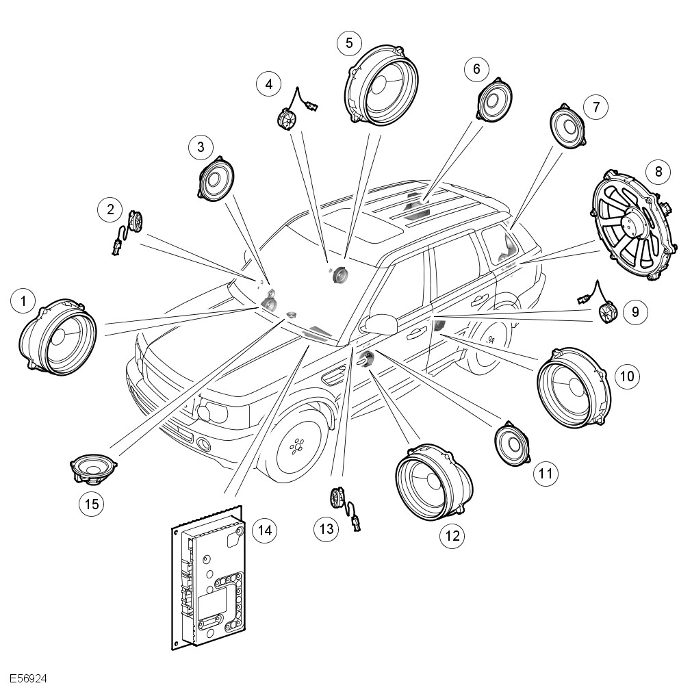 The Premium Audio - Harman/Kardon LOGIC7 audio speaker system is driven by an amplifier located under the RH front seat. The amplifier is controlled by the Integrated Head Unit (IHU) on the MOST bus and supplies 12x50 Watts output, giving a total system power rating of 600 Watts. The system comprises: