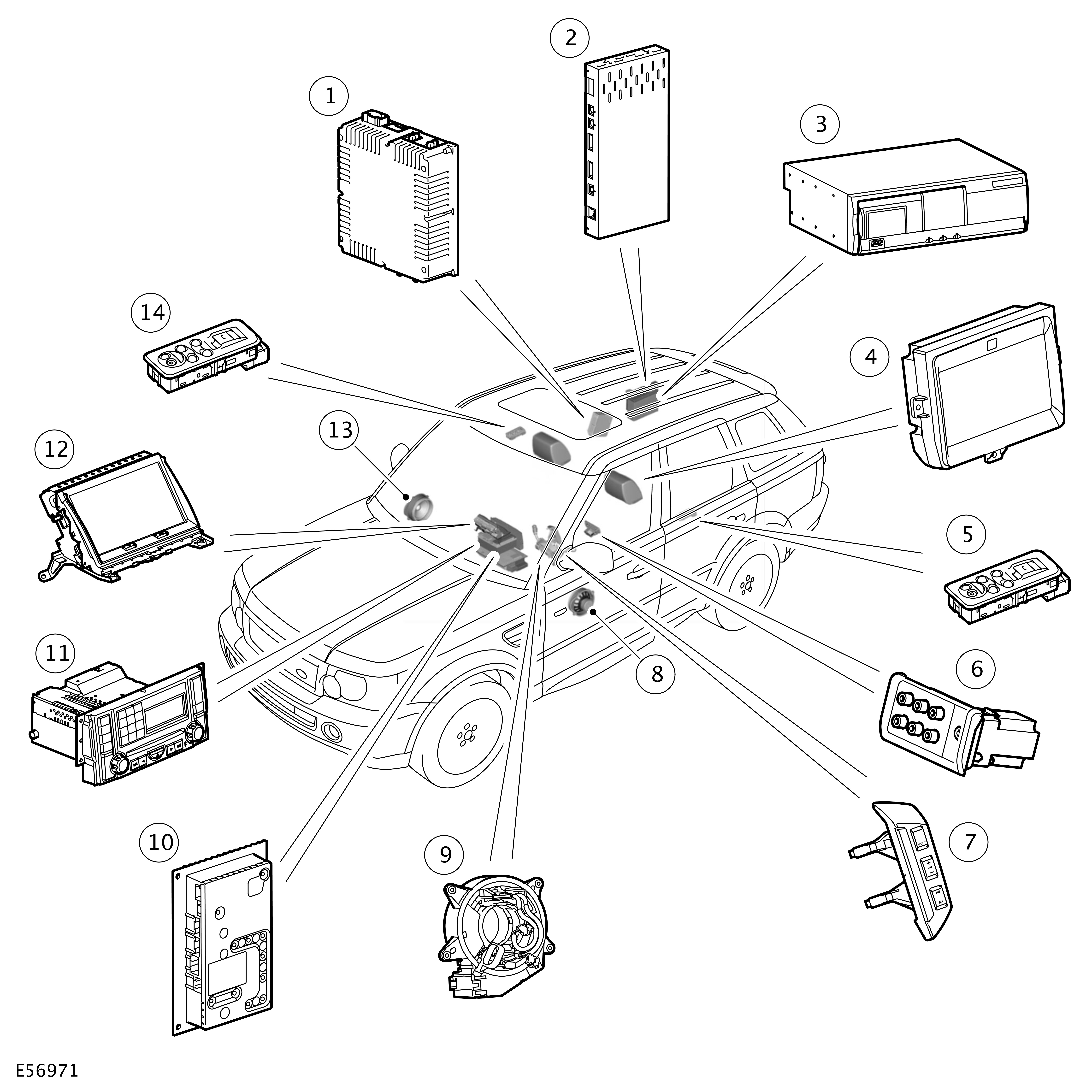 | 13 | Rear door remote audio controls/headphone socket and window switch |