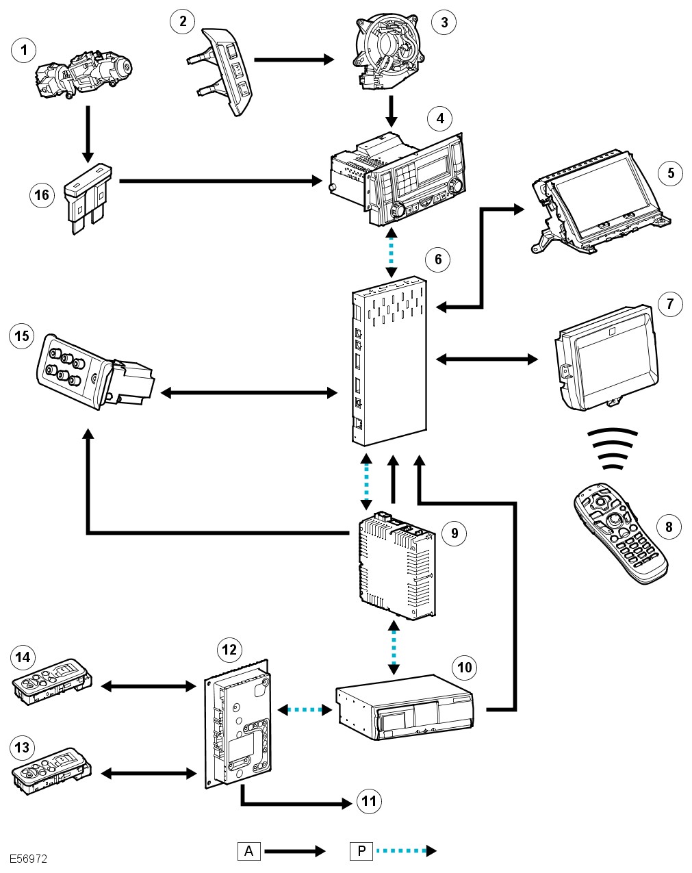 The remote control transmits an infrared signal in response to operation of a button. The signal is received by a sensor located on each RSE LCD screen and is passed, via an IS bus to the RSE module. From the RSE module the signal is passed on an Alpine proprietary bus known as the Ai Net, to the DVD autochanger. The remote control also allows selection of an auxiliary input from the AVIO panel (video or games console) or selection of audio (radio or CD).