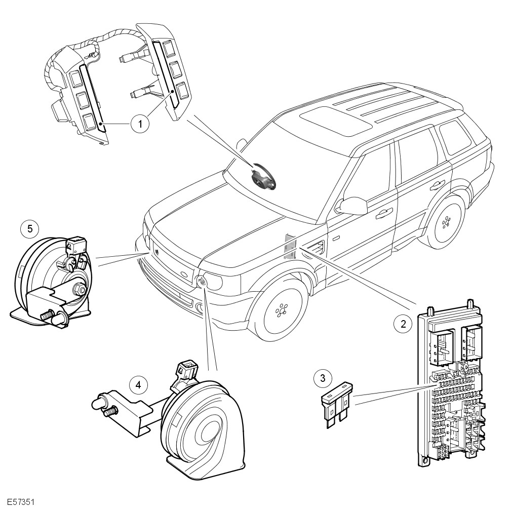 The horns are controlled by a relay which is an integral part of the CJB. The relay contact and solenoid is connected to the vehicle battery via a fusible link (Link 17E) in the battery junction box and a fuse (F12P) in the CJB. The horn switches, when pressed, complete a ground to the relay which energises the solenoid. The energised solenoid closes the relay contact and battery voltage is supplied to each of the horns. When the horn switch is released, the ground for the solenoid is broken, the solenoid is de-energised and the relay contact opens, cutting the voltage supply to the horns.