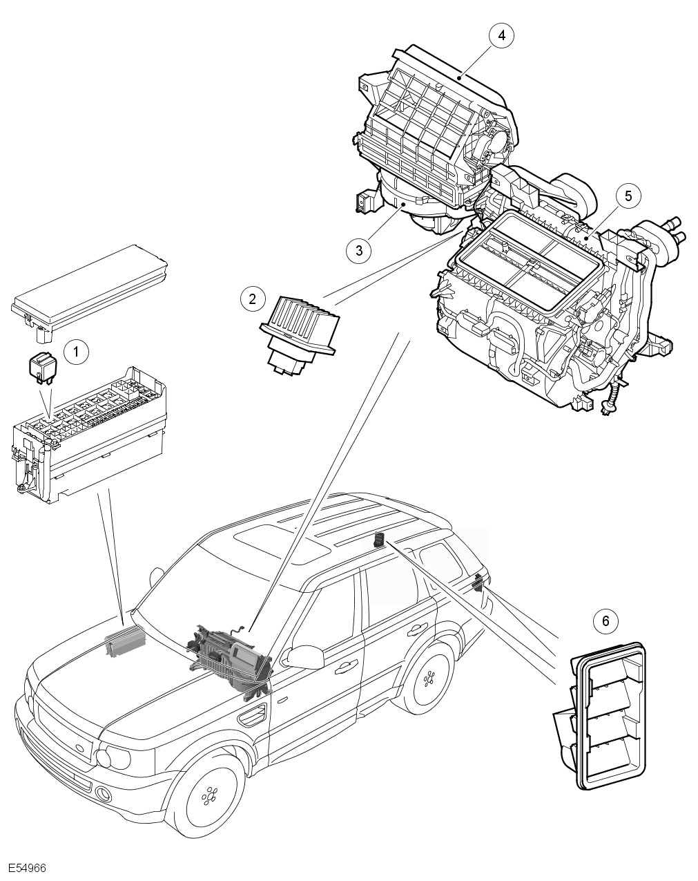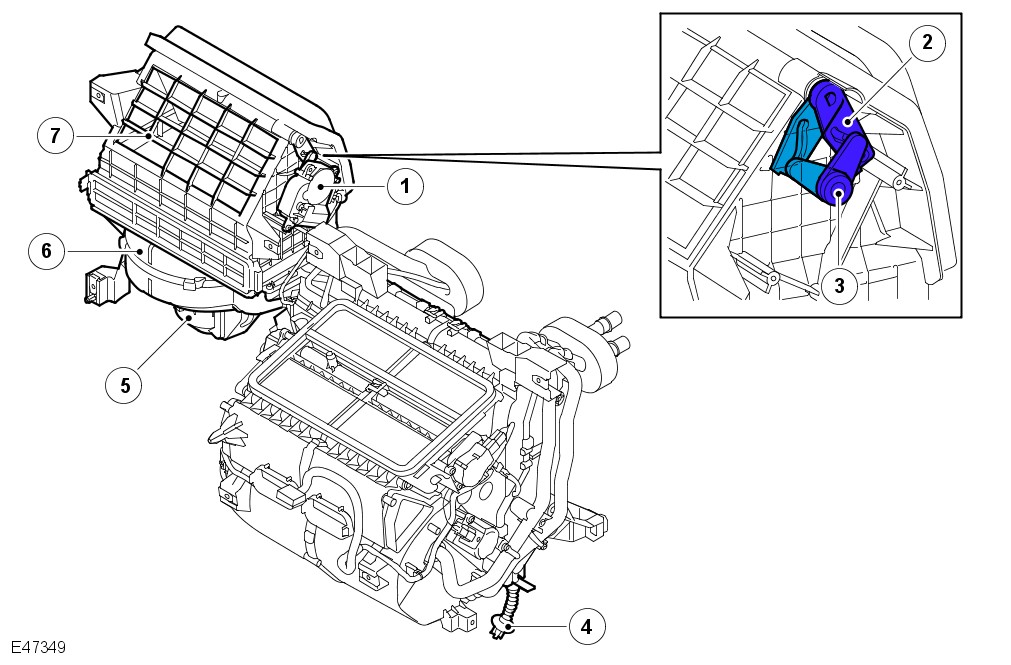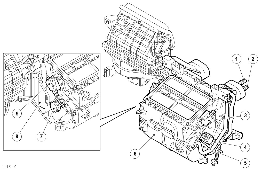 The heater controls the temperature of the air supplied to the distribution ducts, as directed by the ATC module. The heater is installed on the vehicle center-line, between the instrument panel and the engine bulkhead. The heater consists of a casing, formed from plastic moldings, which contains an evaporator, heater core and control doors. Internal passages integrated into the casing guide the air through the casing and separate it into two flows, one for the LH outlets and one for the RH outlets.