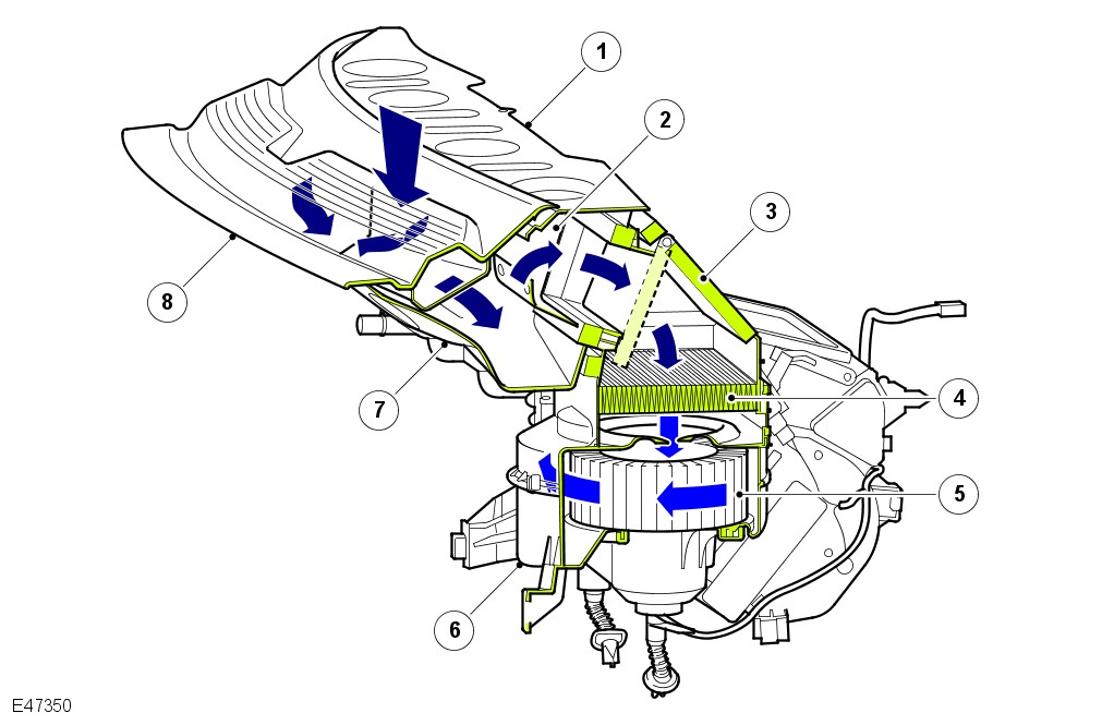 Fresh or recirculated air enters the air inlet duct and passes through the cabin air filter to the hub of the blower. From the blower, the air flows to the outlet of the air inlet duct and into the heater. The blower, and ram effect from the forward motion of the vehicle, forces the air through the air inlet duct.