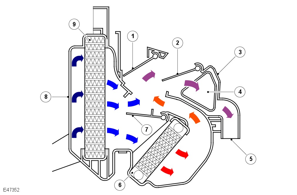 Fresh or recirculated air flows into the heater assembly from the inlet duct. The blower, and ram effect when the vehicle is moving, forces the air through the heater assembly. Air from the cabin exhausts through the ventilation outlets.