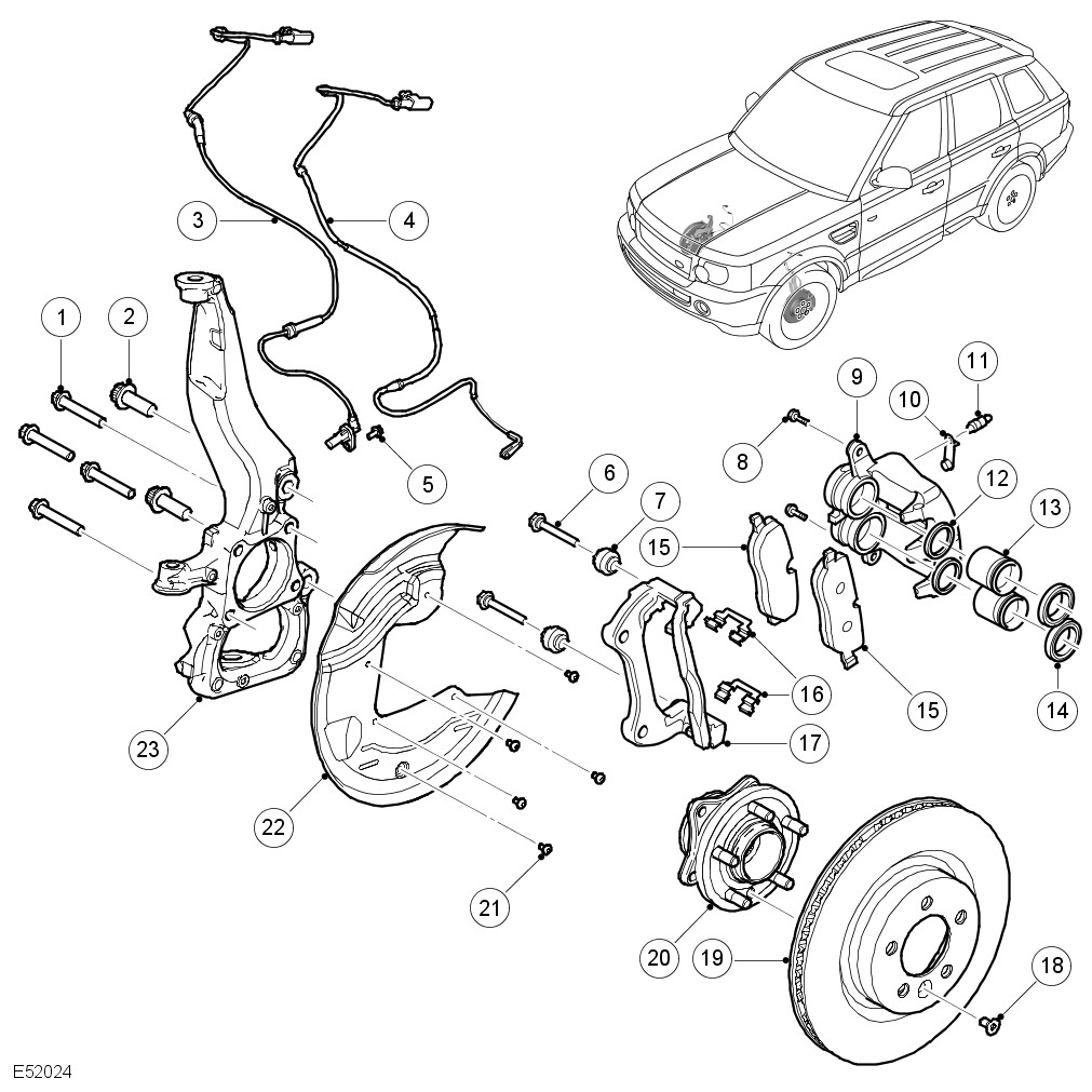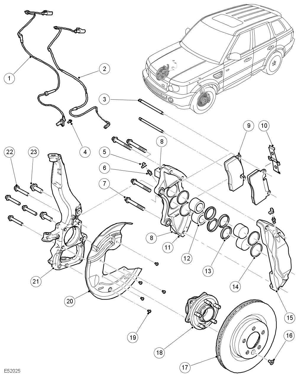 On all models the brake caliper is attached to the rear of the front knuckle. The brake pads are made from an asbestos free material. The inboard brake pad of the left front brake incorporates a wear sensor.