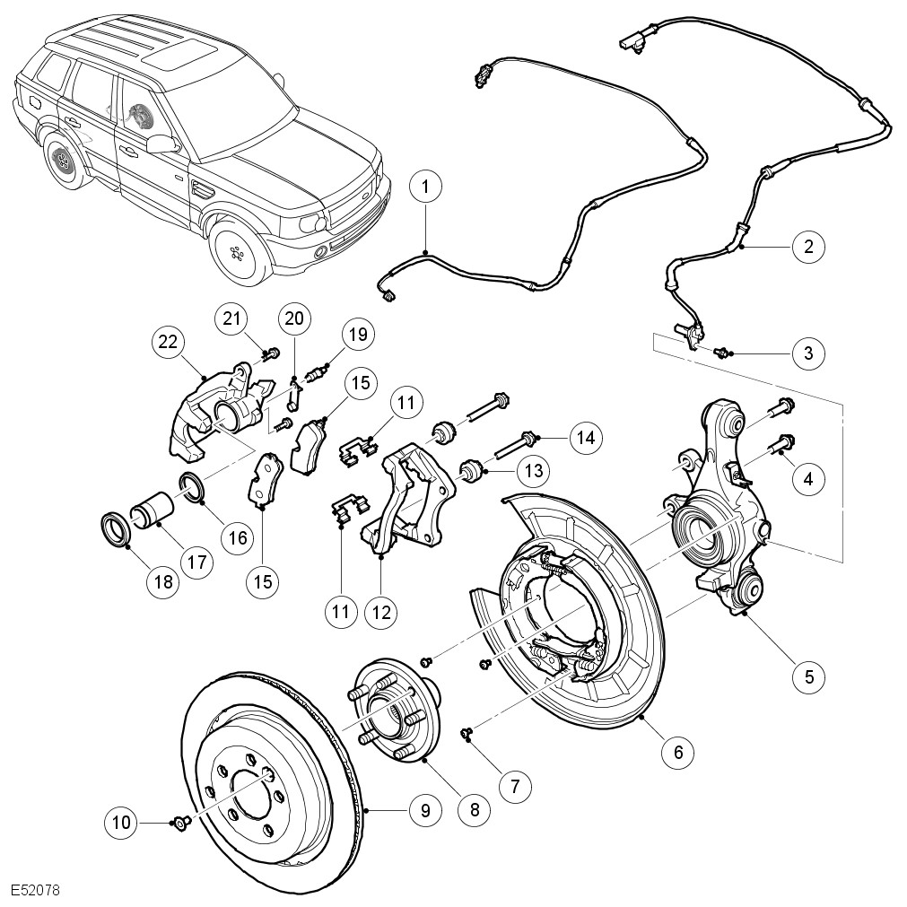 The rear brakes each consist of a single piston brake caliper, a ventilated brake disc and a dust shield (integrated as part of the parking brake). The 4.2L and 4.4L models feature a different caliper and a larger diameter brake disc than 2.7L diesel models. The dust shield and parking brake are common on all models.