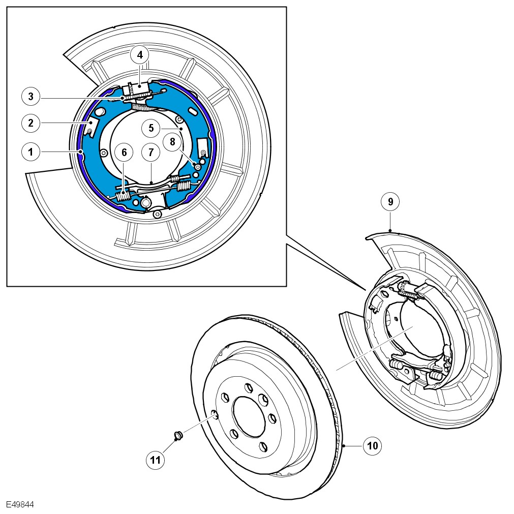 Each drum brake consists of a pair of brake shoes installed on a backplate attached to the rear hub carrier. The brake shoes operate on the drum integrated into the rear brake disc. The orientation of the brake shoes differ by 180° between the LH and RH brakes.