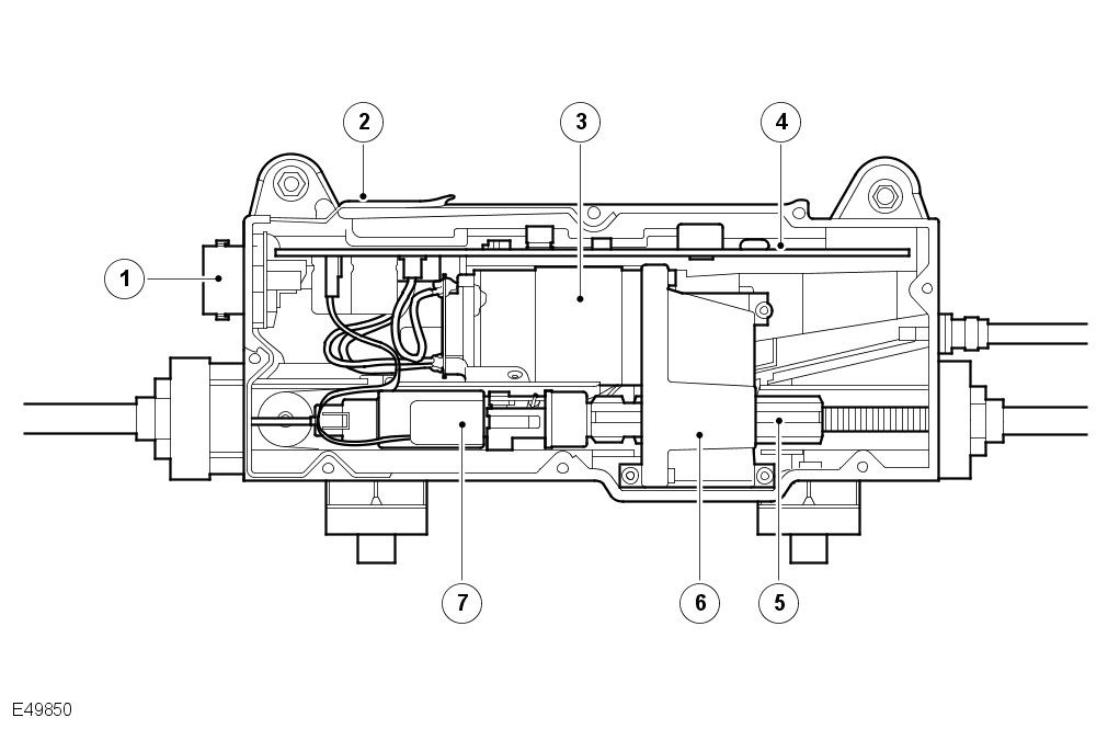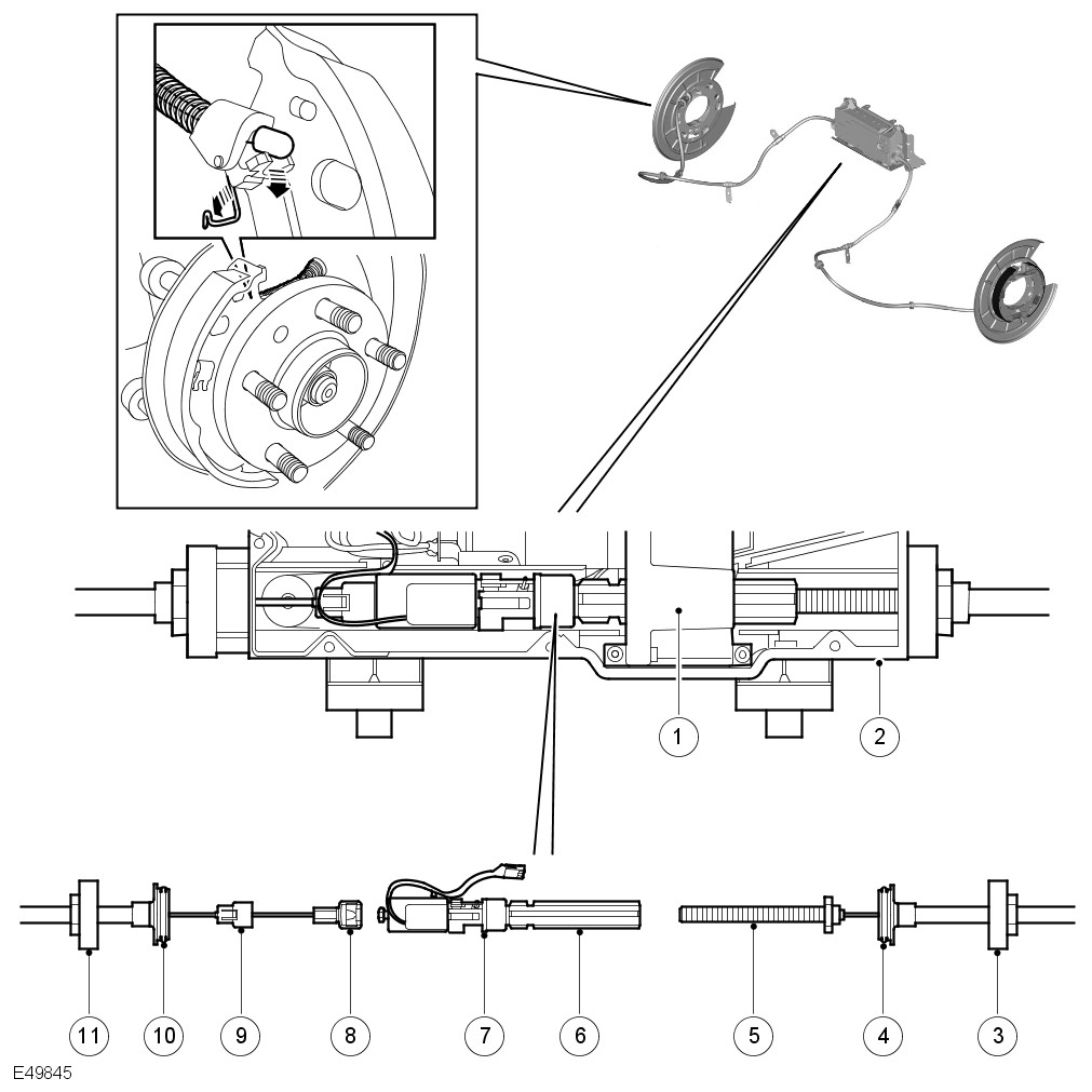 To apply or release the drum brakes, the parking brake module runs the electric motor, which drives the gearbox. The gearbox turns the spline shaft to increase or decrease the tension in the brake cables. The parking brake module monitors the load exerted by the brake cables using the input from the force sensor.