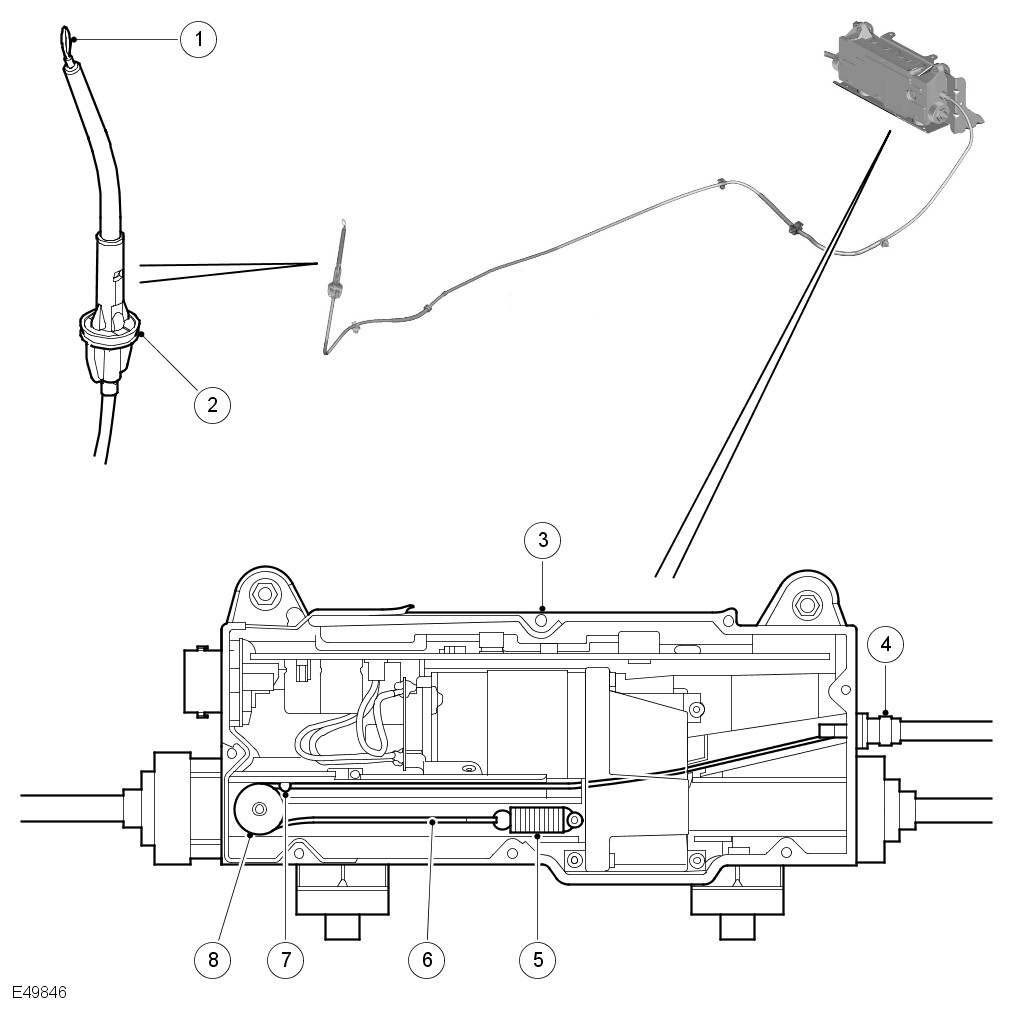 The pull required to release the latch is approximately 200 N (45 lbf). When the pull ring of the emergency release cable is released, the spring in the parking brake module retracts the inner cable and the nipple moves away from the pawl operating lever.