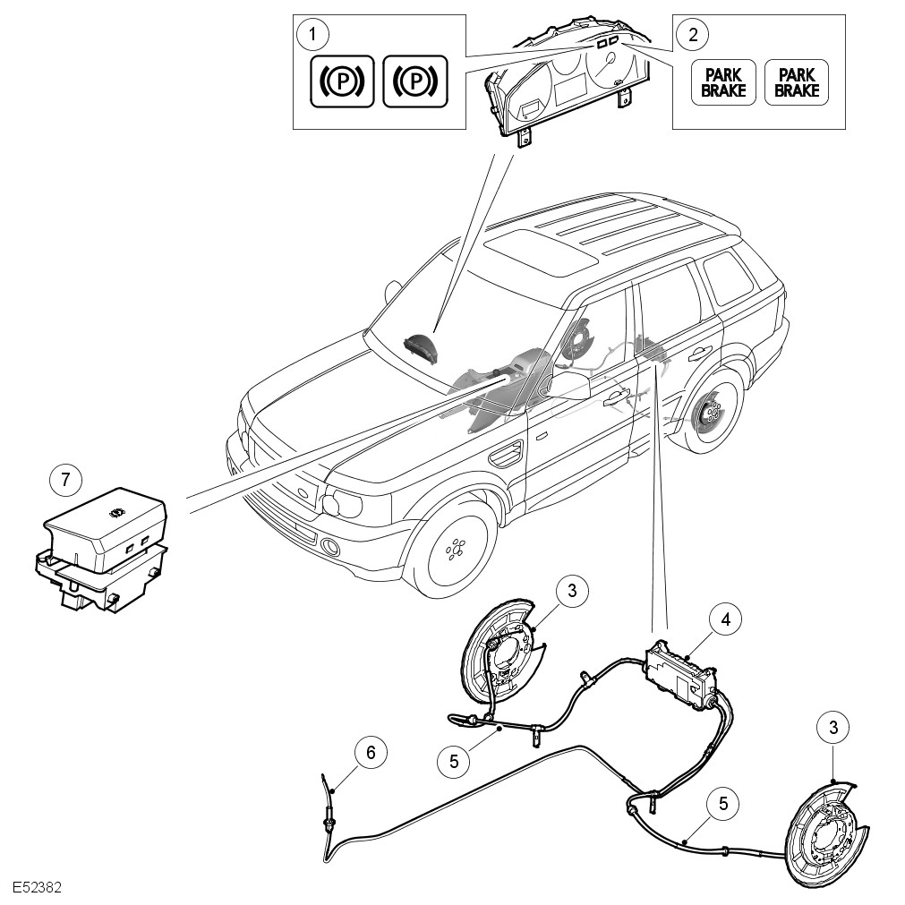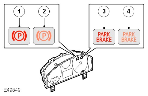 If a single microswitch fault is detected, the parking brake module signals the instrument cluster to illuminate the amber parking brake warning indicator. The parking brake module also signals the instrument cluster to display a message advising there is a parking brake fault. During an apply actuation, the parking brake module also signals the instrument cluster to flash the red parking brake warning indicator.