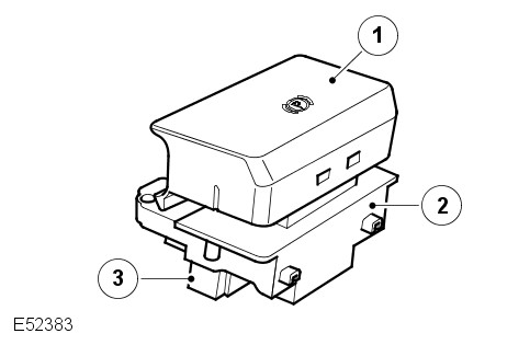 The parking brake module is installed on a support bracket attached to the front of the spare wheel carrier. Two rubber mounts, installed on lugs on the underside of the parking brake module, locate in holes in the support bracket. The top corners of the parking brake module are secured to the support bracket with rubber mounts and flanged nuts.