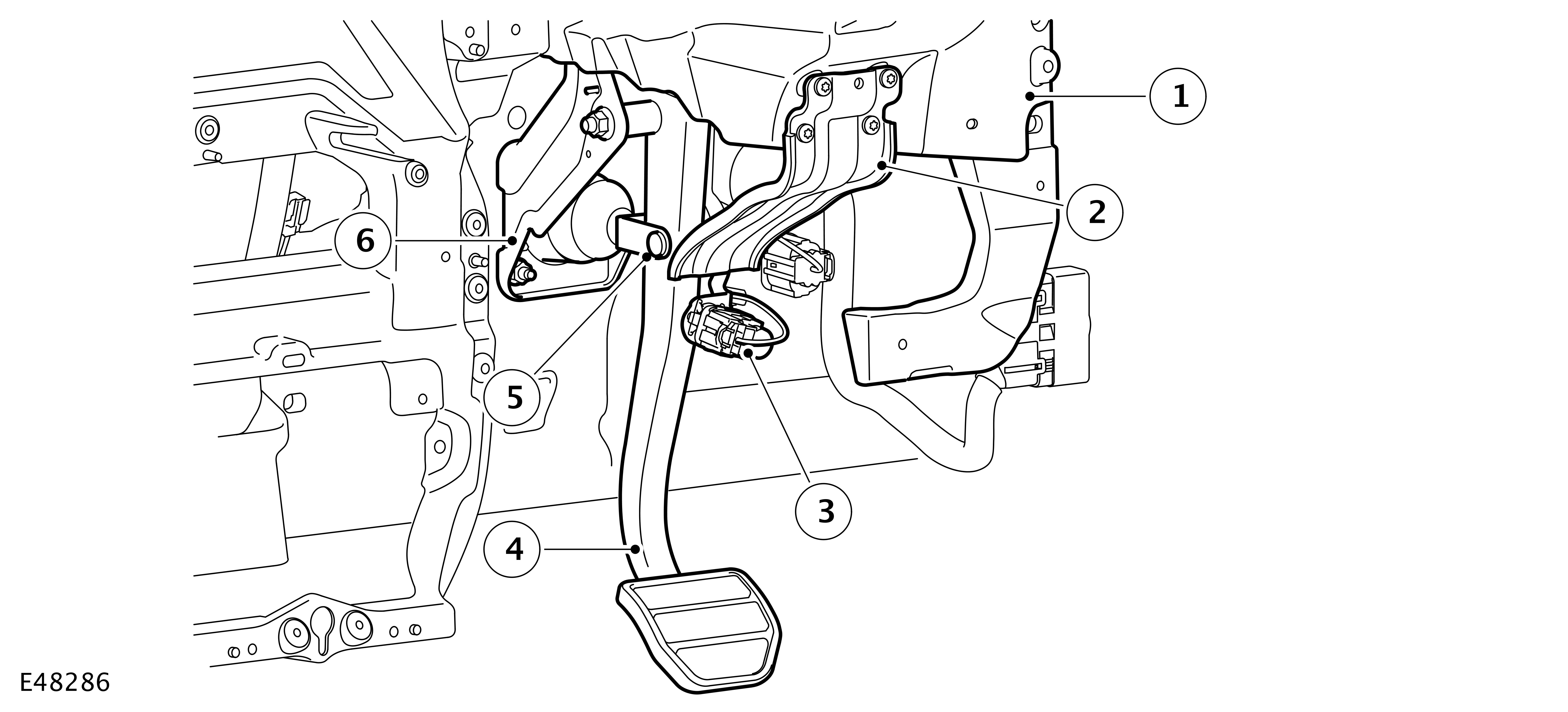 The brake pedal is mounted in a bracket attached to the rear side of the engine bulkhead. A clevis pin and clip connect the brake pedal to the push rod of the brake booster. A brake pedal buffer is installed on the in-vehicle cross beam to restrain rearward movement of the brake pedal in an accident.