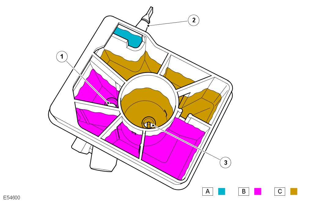 A = Clutch reservoir (reference, not used); B = Primary circuit reservoir; C = Secondary circuit reservoir