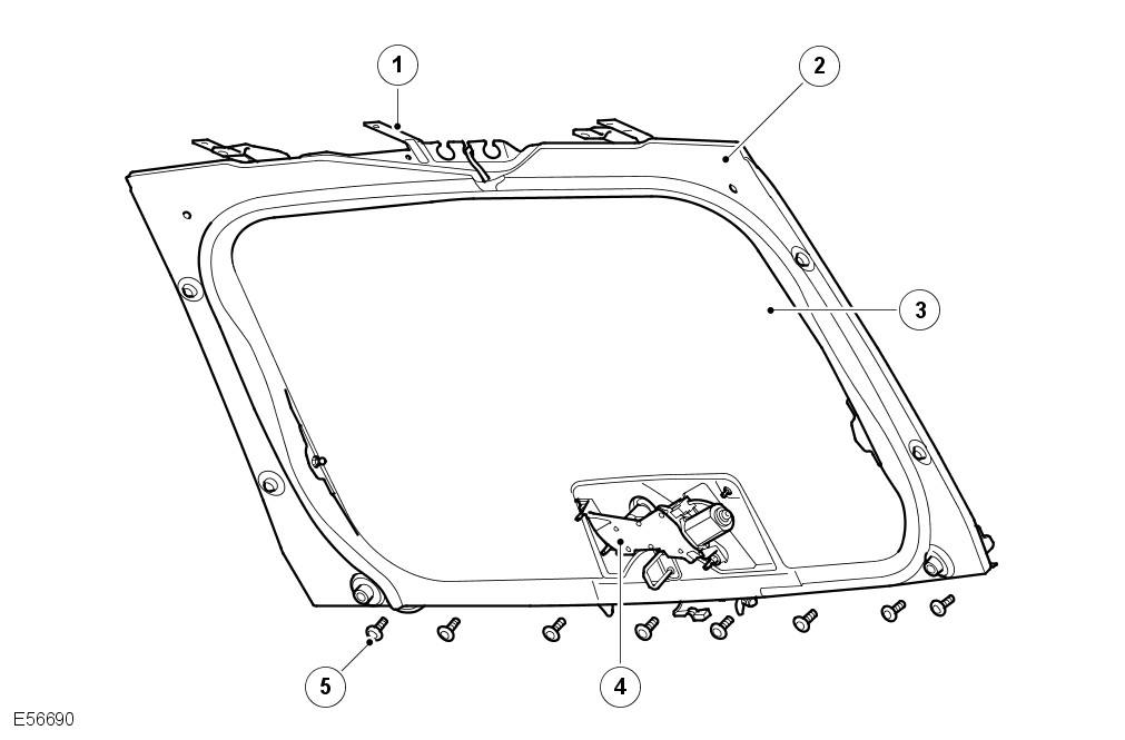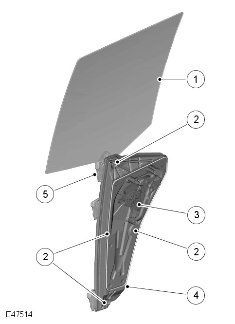 The tempered glass tinted green rear window is bonded to the upper tail doorframe using PU sealant. Fitted to the inner surface of the rear screen are the heating elements and an extra FM antenna for diversity tuning, if fitted. For additional information, refer to: Antenna (415-02 Antenna, Description and Operation).