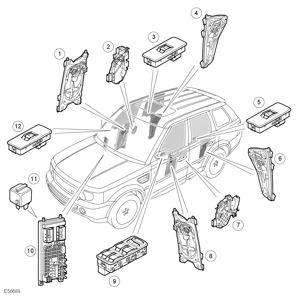 Electric windows are installed in all four doors. The driver's front window incorporates a self-contained 'Anti-trap' regulator, which features one-shot up and one-shot down functionality. All the passenger windows are hard wired and are powered via the window lift relay in the Central Junction Box (CJB).