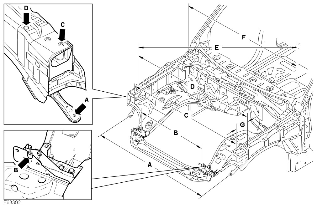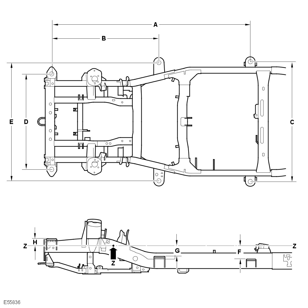 | A | Hood latch panel, lower LH outer fixing | Hood latch panel, lower RH outer fixing | 1503.2 (59.18) |