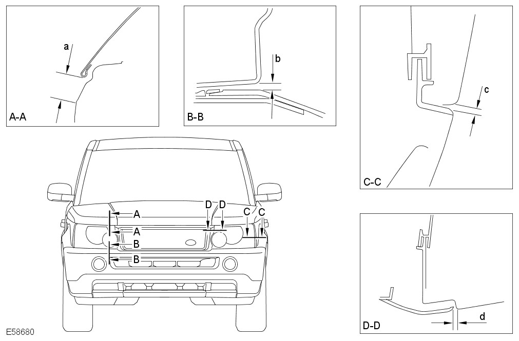 | D-D | Headlamp to Grille | 4.0 (0.157) ± 1.2 (0.0472) | 0.0 ± 1.0 (0.039) |