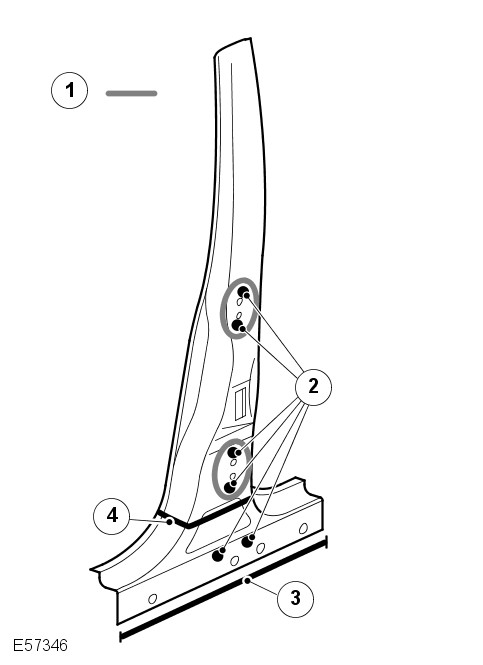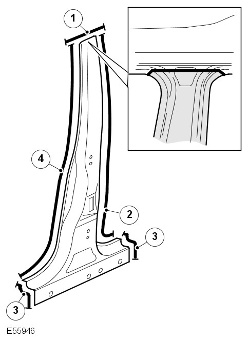 When cutting the damaged panel at the top of the B-pillar, make sure the boron panel behind it is not damaged. For additional information, refer to general information, body repairs. For additional information, refer to: Body Repairs (501-25A Body Repairs - General Information -, Description and Operation).