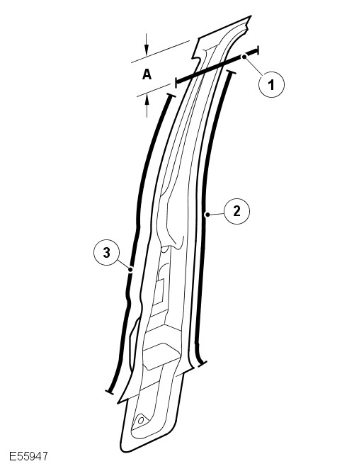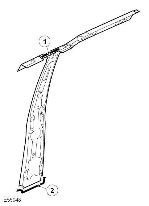 The B-Pillar closing panel is supplied with the cantrail. Remove the B-Pillar closing panel from the cantrail and fit the B-pillar closing panel to the B-Pillar reinforcement, as shown in graphic E55948 and E55947.