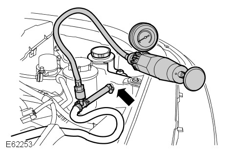 - Install the 'T' piece adaptor (part of the cooling system test kit) between the coolant expansion tank and the coolant bleed hose.