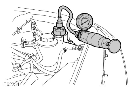 - Slowly pressurize the cooling system to 1.5 bar (150kPa) (22 psi), check the pressure over a 5 minute period. A small pressure decay of approximately 0.15 bar (15 »kPa) (1 psi) over the first minute is normal, as the air in the expansion tank cools.