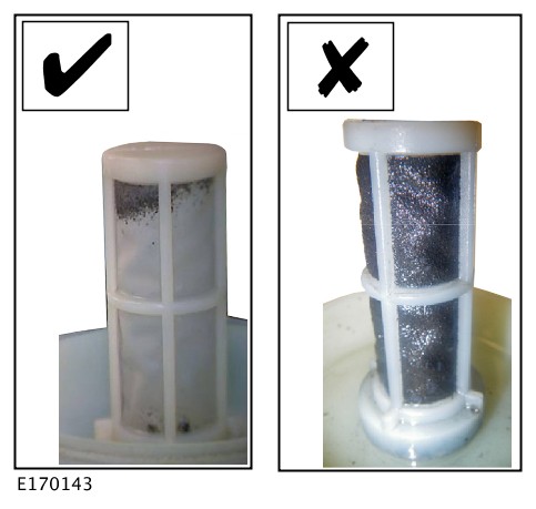 The filter mesh should not be more than 30% blocked (as in left-hand picture below), if the mesh is more than 30% blocked (as in the right-hand picture below), the power steering system fluid reservoir should be replaced.