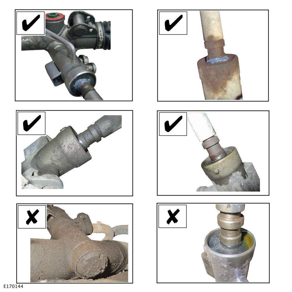 Misting/Dampness around pinions, bellows and on the rack bar can be mis-diagnosed as leaks. This is normal and suspected leaks should always be verified by cleaning and chalking. Refer to Component Checks in this section for guidance on identification of leaks |