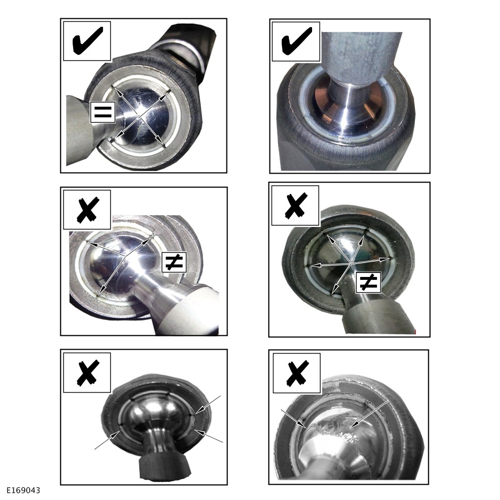 The visible surfaces of the ball-joints should be inspected for scarring, scratches or other obvious damage. The visible ball-joint surfaces should be free from any scarring, scratches or other obvious damage (as in the top-right picture above). If there is evidence of seat damage, then the steering gear should be checked thoroughly for other symptoms that may have been induced by the impact (e.g.: Noisy or heavy steering). If further damage is noted, it may be necessary to replace the steering gear as part of the accident damage/abuse repair