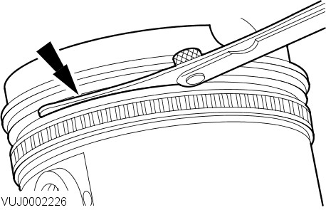 The piston ring must protrude from the piston groove. To determine the piston ring clearance, insert the Feeler Gauge right to the back of the groove, behind the wear ridge.